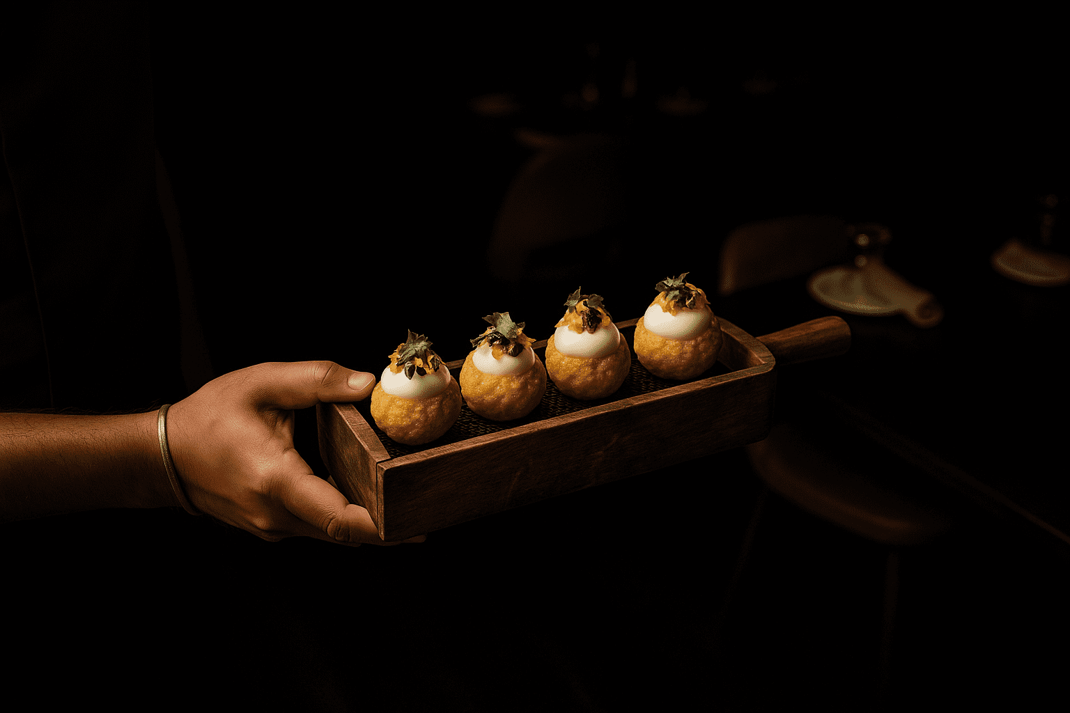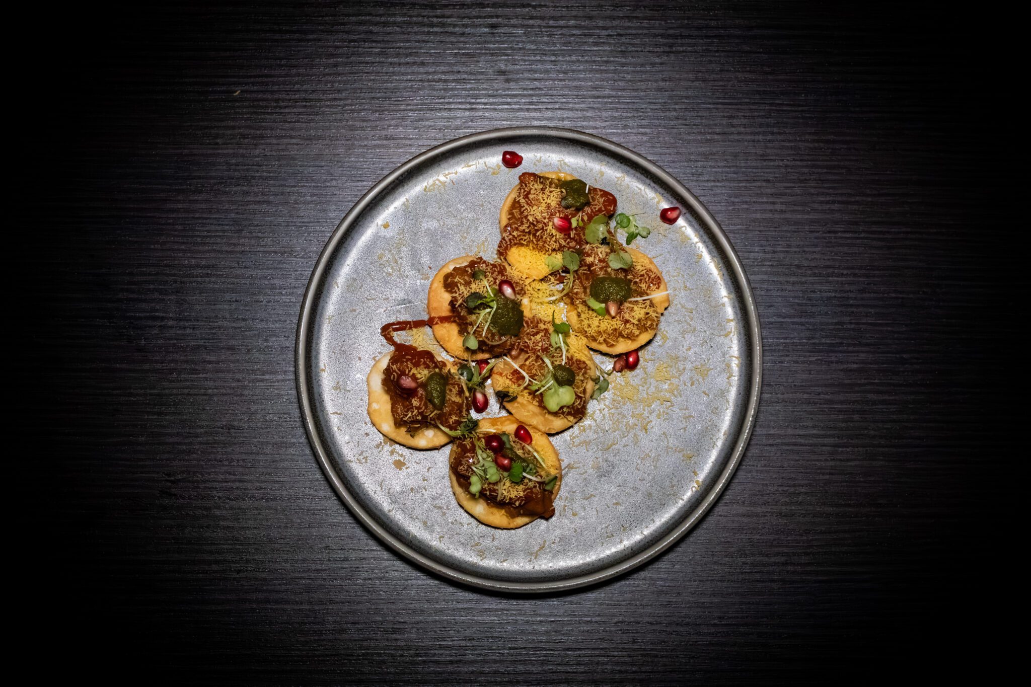 Dabeli nostalgia reimagined. Tiny puri explosions of spiced potato and masala with chutneys.