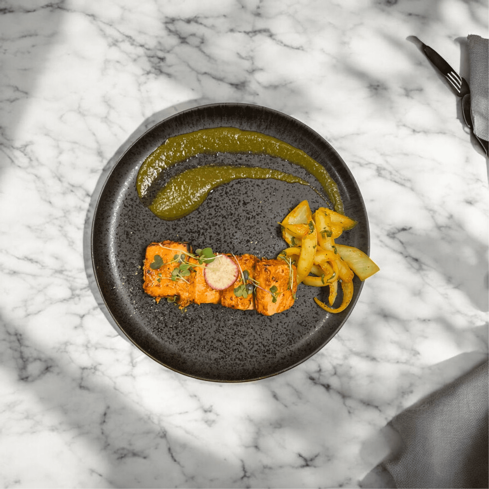 Paneer aglow with crushed chili specks and creamy malai